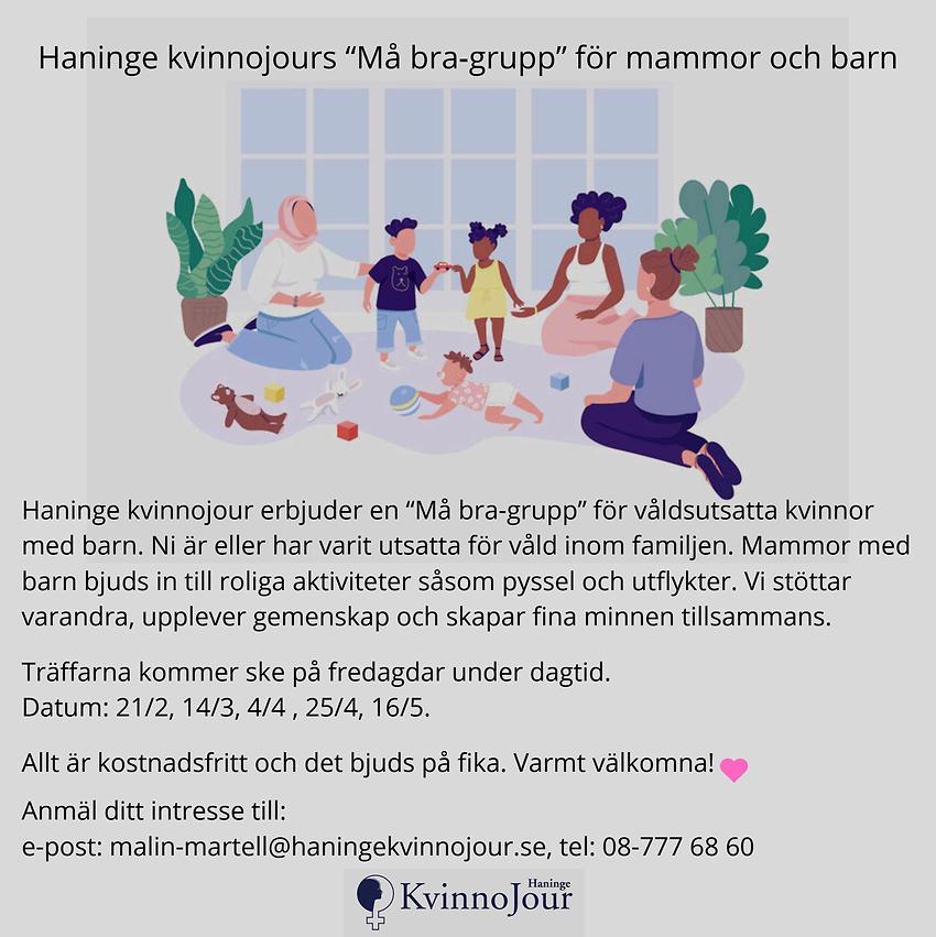 Haninge kvinnojour erbjuder en "Må bra"-grupp för våldsutsatta kvinnor med barn. Ni är eller har varit utsatta för våld inom familjen. Mammor med barn bjuds in till roliga aktiviteter såsom pyssel och utflykter. VI stöttar varandra, upplever gemenskap och skapar fina minnen tillsammans!