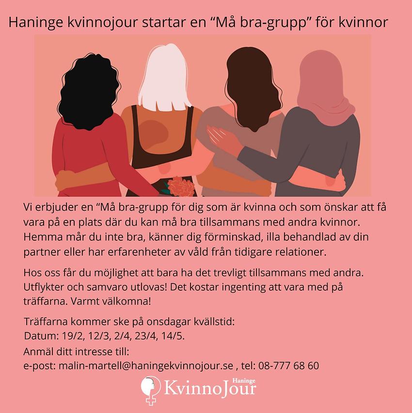 Haninge kvinnojour erbjuder en "Må bra"-grupp för dig som är kvinna och som önskar att få vara på en plats där du kan må bra tillsammans med andra kvinnor. Hemma mår du inte bra, känner dig förminskad, illa behandlad av din partner eller har erfarenheter av våld från tidigare relationer.