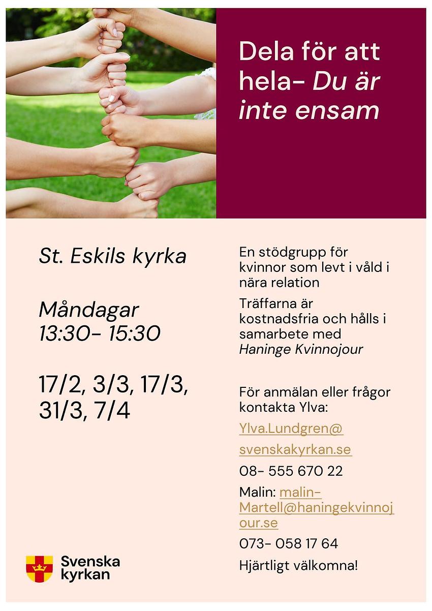 Träffarna hålls i St.Eskils kyrka på måndagar kl.13.30-15.30 Datum: 17/2, 3/3, 17/3, 31/3 och 7/4.